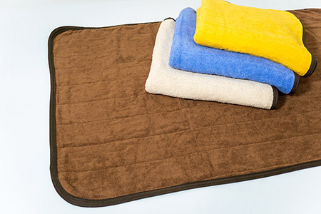 色落ちしにくいスレン染めで、またバイアス部(まわりの茶色い部分)はポリエステル100%ですので、耐洗に強いサウナマットです。
